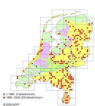 Het aantal atlasblokken (5x5 km) waarin de soort is gemeld binnen een periode van vijf jaar (vanaf 1980) of twintig jaar. Niet gecorrigeerd voor waarnemersinspanning en het aantal doorgegeven waarnemingen kan sterk variëren per periode, dus een trend in verspreiding kan hier niet direct uit worden afgelezen. Het opgegeven jaartal is het eerste jaar van de periode. Bron: gevalideerde waarnemingen uit de NDFF.
