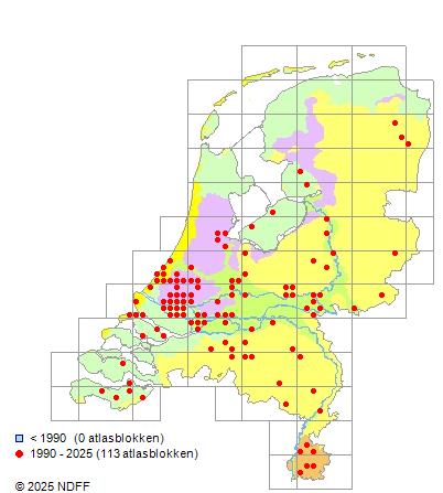 Het aantal atlasblokken (5x5 km) waarin de soort is gemeld binnen een periode van vijf jaar (vanaf 1980) of twintig jaar. Niet gecorrigeerd voor waarnemersinspanning en het aantal doorgegeven waarnemingen kan sterk variëren per periode, dus een trend in verspreiding kan hier niet direct uit worden afgelezen. Het opgegeven jaartal is het eerste jaar van de periode. Bron: gevalideerde waarnemingen uit de NDFF.