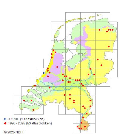 Het aantal atlasblokken (5x5 km) waarin de soort is gemeld binnen een periode van vijf jaar (vanaf 1980) of twintig jaar. Niet gecorrigeerd voor waarnemersinspanning en het aantal doorgegeven waarnemingen kan sterk variëren per periode, dus een trend in verspreiding kan hier niet direct uit worden afgelezen. Het opgegeven jaartal is het eerste jaar van de periode. Bron: gevalideerde waarnemingen uit de NDFF.