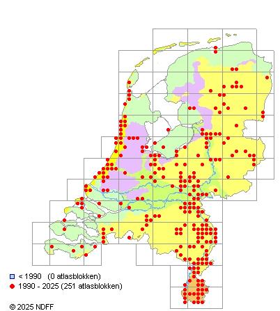 Het aantal atlasblokken (5x5 km) waarin de soort is gemeld binnen een periode van vijf jaar (vanaf 1980) of twintig jaar. Niet gecorrigeerd voor waarnemersinspanning en het aantal doorgegeven waarnemingen kan sterk variëren per periode, dus een trend in verspreiding kan hier niet direct uit worden afgelezen. Het opgegeven jaartal is het eerste jaar van de periode. Bron: gevalideerde waarnemingen uit de NDFF.