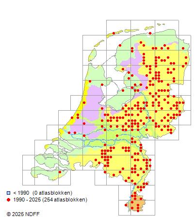 Het aantal atlasblokken (5x5 km) waarin de soort is gemeld binnen een periode van vijf jaar (vanaf 1980) of twintig jaar. Niet gecorrigeerd voor waarnemersinspanning en het aantal doorgegeven waarnemingen kan sterk variëren per periode, dus een trend in verspreiding kan hier niet direct uit worden afgelezen. Het opgegeven jaartal is het eerste jaar van de periode. Bron: gevalideerde waarnemingen uit de NDFF.