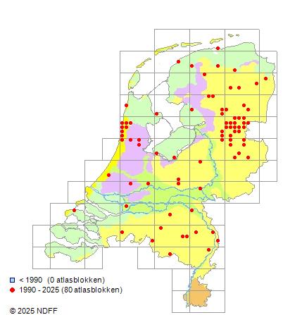 Het aantal atlasblokken (5x5 km) waarin de soort is gemeld binnen een periode van vijf jaar (vanaf 1980) of twintig jaar. Niet gecorrigeerd voor waarnemersinspanning en het aantal doorgegeven waarnemingen kan sterk variëren per periode, dus een trend in verspreiding kan hier niet direct uit worden afgelezen. Het opgegeven jaartal is het eerste jaar van de periode. Bron: gevalideerde waarnemingen uit de NDFF.