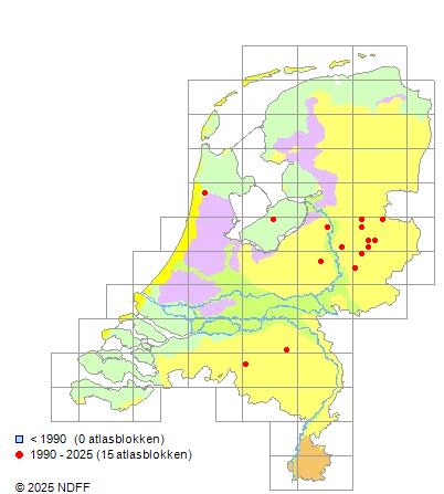 Het aantal atlasblokken (5x5 km) waarin de soort is gemeld binnen een periode van vijf jaar (vanaf 1980) of twintig jaar. Niet gecorrigeerd voor waarnemersinspanning en het aantal doorgegeven waarnemingen kan sterk variëren per periode, dus een trend in verspreiding kan hier niet direct uit worden afgelezen. Het opgegeven jaartal is het eerste jaar van de periode. Bron: gevalideerde waarnemingen uit de NDFF.