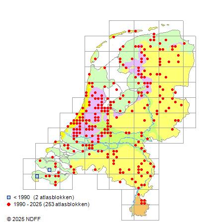 Het aantal atlasblokken (5x5 km) waarin de soort is gemeld binnen een periode van vijf jaar (vanaf 1980) of twintig jaar. Niet gecorrigeerd voor waarnemersinspanning en het aantal doorgegeven waarnemingen kan sterk variëren per periode, dus een trend in verspreiding kan hier niet direct uit worden afgelezen. Het opgegeven jaartal is het eerste jaar van de periode. Bron: gevalideerde waarnemingen uit de NDFF.