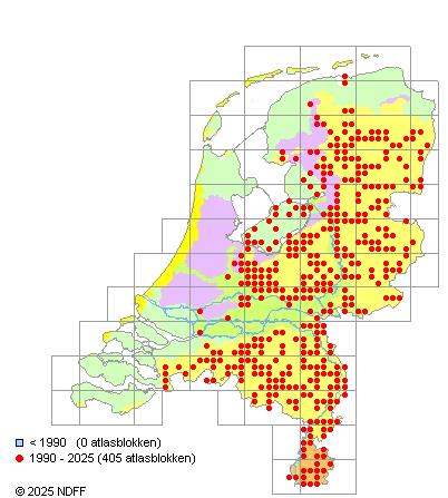 Het aantal atlasblokken (5x5 km) waarin de soort is gemeld binnen een periode van vijf jaar (vanaf 1980) of twintig jaar. Niet gecorrigeerd voor waarnemersinspanning en het aantal doorgegeven waarnemingen kan sterk variëren per periode, dus een trend in verspreiding kan hier niet direct uit worden afgelezen. Het opgegeven jaartal is het eerste jaar van de periode. Bron: gevalideerde waarnemingen uit de NDFF.