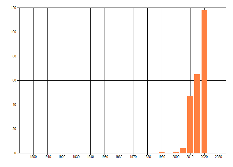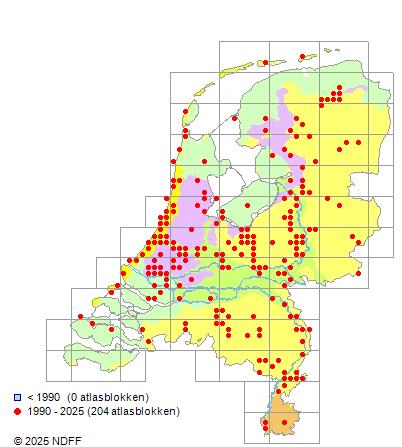 Het aantal atlasblokken (5x5 km) waarin de soort is gemeld binnen een periode van vijf jaar (vanaf 1980) of twintig jaar. Niet gecorrigeerd voor waarnemersinspanning en het aantal doorgegeven waarnemingen kan sterk variëren per periode, dus een trend in verspreiding kan hier niet direct uit worden afgelezen. Het opgegeven jaartal is het eerste jaar van de periode. Bron: gevalideerde waarnemingen uit de NDFF.