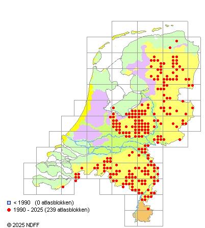 Het aantal atlasblokken (5x5 km) waarin de soort is gemeld binnen een periode van vijf jaar (vanaf 1980) of twintig jaar. Niet gecorrigeerd voor waarnemersinspanning en het aantal doorgegeven waarnemingen kan sterk variëren per periode, dus een trend in verspreiding kan hier niet direct uit worden afgelezen. Het opgegeven jaartal is het eerste jaar van de periode. Bron: gevalideerde waarnemingen uit de NDFF.