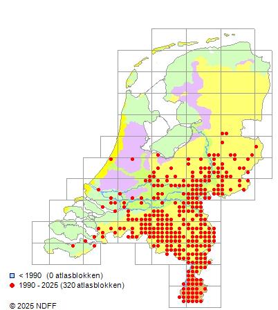 Het aantal atlasblokken (5x5 km) waarin de soort is gemeld binnen een periode van vijf jaar (vanaf 1980) of twintig jaar. Niet gecorrigeerd voor waarnemersinspanning en het aantal doorgegeven waarnemingen kan sterk variëren per periode, dus een trend in verspreiding kan hier niet direct uit worden afgelezen. Het opgegeven jaartal is het eerste jaar van de periode. Bron: gevalideerde waarnemingen uit de NDFF.