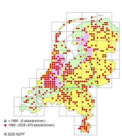 Het aantal atlasblokken (5x5 km) waarin de soort is gemeld binnen een periode van vijf jaar (vanaf 1980) of twintig jaar. Niet gecorrigeerd voor waarnemersinspanning en het aantal doorgegeven waarnemingen kan sterk variëren per periode, dus een trend in verspreiding kan hier niet direct uit worden afgelezen. Het opgegeven jaartal is het eerste jaar van de periode. Bron: gevalideerde waarnemingen uit de NDFF.