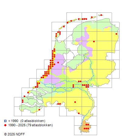 Het aantal atlasblokken (5x5 km) waarin de soort is gemeld binnen een periode van vijf jaar (vanaf 1980) of twintig jaar. Niet gecorrigeerd voor waarnemersinspanning en het aantal doorgegeven waarnemingen kan sterk variëren per periode, dus een trend in verspreiding kan hier niet direct uit worden afgelezen. Het opgegeven jaartal is het eerste jaar van de periode. Bron: gevalideerde waarnemingen uit de NDFF.