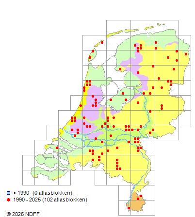 Het aantal atlasblokken (5x5 km) waarin de soort is gemeld binnen een periode van vijf jaar (vanaf 1980) of twintig jaar. Niet gecorrigeerd voor waarnemersinspanning en het aantal doorgegeven waarnemingen kan sterk variëren per periode, dus een trend in verspreiding kan hier niet direct uit worden afgelezen. Het opgegeven jaartal is het eerste jaar van de periode. Bron: gevalideerde waarnemingen uit de NDFF.