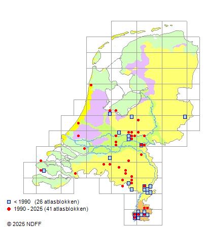 Het aantal atlasblokken (5x5 km) waarin de soort is gemeld binnen een periode van vijf jaar (vanaf 1980) of twintig jaar. Niet gecorrigeerd voor waarnemersinspanning en het aantal doorgegeven waarnemingen kan sterk variëren per periode, dus een trend in verspreiding kan hier niet direct uit worden afgelezen. Het opgegeven jaartal is het eerste jaar van de periode. Bron: gevalideerde waarnemingen uit de NDFF.