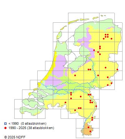 Het aantal atlasblokken (5x5 km) waarin de soort is gemeld binnen een periode van vijf jaar (vanaf 1980) of twintig jaar. Niet gecorrigeerd voor waarnemersinspanning en het aantal doorgegeven waarnemingen kan sterk variëren per periode, dus een trend in verspreiding kan hier niet direct uit worden afgelezen. Het opgegeven jaartal is het eerste jaar van de periode. Bron: gevalideerde waarnemingen uit de NDFF.