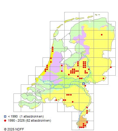 Het aantal atlasblokken (5x5 km) waarin de soort is gemeld binnen een periode van vijf jaar (vanaf 1980) of twintig jaar. Niet gecorrigeerd voor waarnemersinspanning en het aantal doorgegeven waarnemingen kan sterk variëren per periode, dus een trend in verspreiding kan hier niet direct uit worden afgelezen. Het opgegeven jaartal is het eerste jaar van de periode. Bron: gevalideerde waarnemingen uit de NDFF.