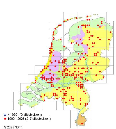 Het aantal atlasblokken (5x5 km) waarin de soort is gemeld binnen een periode van vijf jaar (vanaf 1980) of twintig jaar. Niet gecorrigeerd voor waarnemersinspanning en het aantal doorgegeven waarnemingen kan sterk variëren per periode, dus een trend in verspreiding kan hier niet direct uit worden afgelezen. Het opgegeven jaartal is het eerste jaar van de periode. Bron: gevalideerde waarnemingen uit de NDFF.