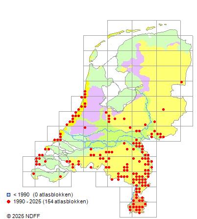 Het aantal atlasblokken (5x5 km) waarin de soort is gemeld binnen een periode van vijf jaar (vanaf 1980) of twintig jaar. Niet gecorrigeerd voor waarnemersinspanning en het aantal doorgegeven waarnemingen kan sterk variëren per periode, dus een trend in verspreiding kan hier niet direct uit worden afgelezen. Het opgegeven jaartal is het eerste jaar van de periode. Bron: gevalideerde waarnemingen uit de NDFF.