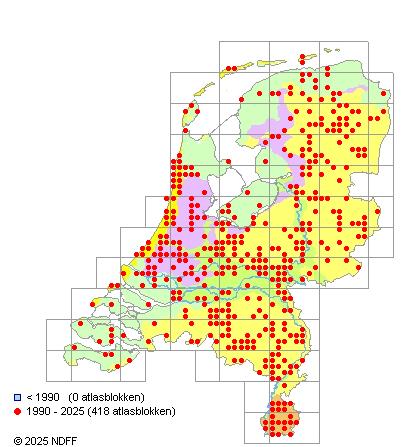 Het aantal atlasblokken (5x5 km) waarin de soort is gemeld binnen een periode van vijf jaar (vanaf 1980) of twintig jaar. Niet gecorrigeerd voor waarnemersinspanning en het aantal doorgegeven waarnemingen kan sterk variëren per periode, dus een trend in verspreiding kan hier niet direct uit worden afgelezen. Het opgegeven jaartal is het eerste jaar van de periode. Bron: gevalideerde waarnemingen uit de NDFF.