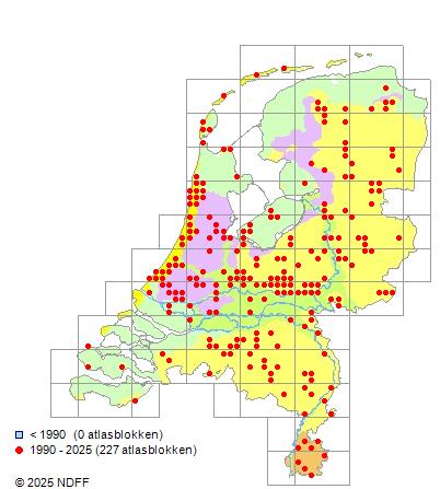 Het aantal atlasblokken (5x5 km) waarin de soort is gemeld binnen een periode van vijf jaar (vanaf 1980) of twintig jaar. Niet gecorrigeerd voor waarnemersinspanning en het aantal doorgegeven waarnemingen kan sterk variëren per periode, dus een trend in verspreiding kan hier niet direct uit worden afgelezen. Het opgegeven jaartal is het eerste jaar van de periode. Bron: gevalideerde waarnemingen uit de NDFF.