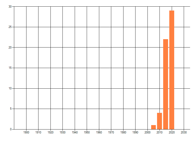 Het aantal atlasblokken (5x5 km) waarin de soort is gemeld binnen een periode van vijf jaar (vanaf 1980) of twintig jaar. Niet gecorrigeerd voor waarnemersinspanning en het aantal doorgegeven waarnemingen kan sterk variëren per periode, dus een trend in verspreiding kan hier niet direct uit worden afgelezen. Het opgegeven jaartal is het eerste jaar van de periode. Bron: gevalideerde waarnemingen uit de NDFF.