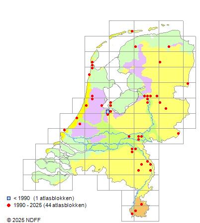 Het aantal atlasblokken (5x5 km) waarin de soort is gemeld binnen een periode van vijf jaar (vanaf 1980) of twintig jaar. Niet gecorrigeerd voor waarnemersinspanning en het aantal doorgegeven waarnemingen kan sterk variëren per periode, dus een trend in verspreiding kan hier niet direct uit worden afgelezen. Het opgegeven jaartal is het eerste jaar van de periode. Bron: gevalideerde waarnemingen uit de NDFF.