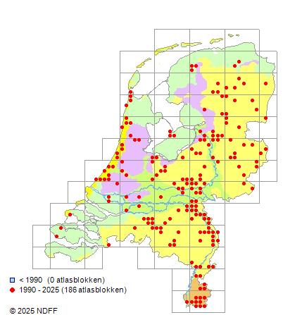 Het aantal atlasblokken (5x5 km) waarin de soort is gemeld binnen een periode van vijf jaar (vanaf 1980) of twintig jaar. Niet gecorrigeerd voor waarnemersinspanning en het aantal doorgegeven waarnemingen kan sterk variëren per periode, dus een trend in verspreiding kan hier niet direct uit worden afgelezen. Het opgegeven jaartal is het eerste jaar van de periode. Bron: gevalideerde waarnemingen uit de NDFF.