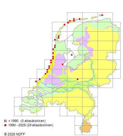 Het aantal atlasblokken (5x5 km) waarin de soort is gemeld binnen een periode van vijf jaar (vanaf 1980) of twintig jaar. Niet gecorrigeerd voor waarnemersinspanning en het aantal doorgegeven waarnemingen kan sterk variëren per periode, dus een trend in verspreiding kan hier niet direct uit worden afgelezen. Het opgegeven jaartal is het eerste jaar van de periode. Bron: gevalideerde waarnemingen uit de NDFF.