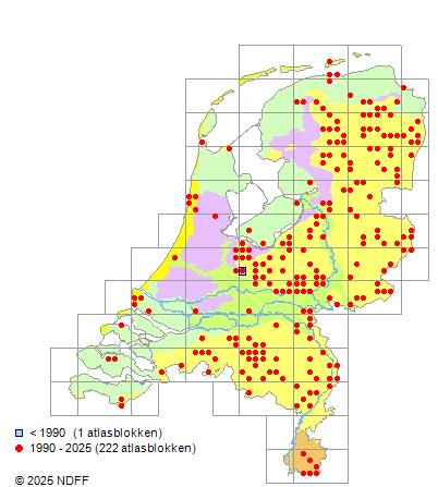 Het aantal atlasblokken (5x5 km) waarin de soort is gemeld binnen een periode van vijf jaar (vanaf 1980) of twintig jaar. Niet gecorrigeerd voor waarnemersinspanning en het aantal doorgegeven waarnemingen kan sterk variëren per periode, dus een trend in verspreiding kan hier niet direct uit worden afgelezen. Het opgegeven jaartal is het eerste jaar van de periode. Bron: gevalideerde waarnemingen uit de NDFF.