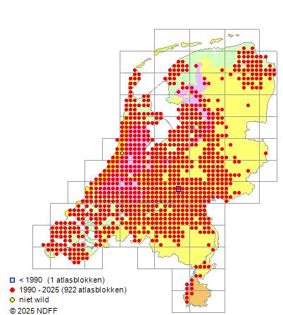 Het aantal atlasblokken (5x5 km) waarin de soort is gemeld binnen een periode van vijf jaar (vanaf 1980) of twintig jaar. Niet gecorrigeerd voor waarnemersinspanning en het aantal doorgegeven waarnemingen kan sterk variëren per periode, dus een trend in verspreiding kan hier niet direct uit worden afgelezen. Het opgegeven jaartal is het eerste jaar van de periode. Bron: gevalideerde waarnemingen uit de NDFF.