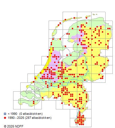 Het aantal atlasblokken (5x5 km) waarin de soort is gemeld binnen een periode van vijf jaar (vanaf 1980) of twintig jaar. Niet gecorrigeerd voor waarnemersinspanning en het aantal doorgegeven waarnemingen kan sterk variëren per periode, dus een trend in verspreiding kan hier niet direct uit worden afgelezen. Het opgegeven jaartal is het eerste jaar van de periode. Bron: gevalideerde waarnemingen uit de NDFF.