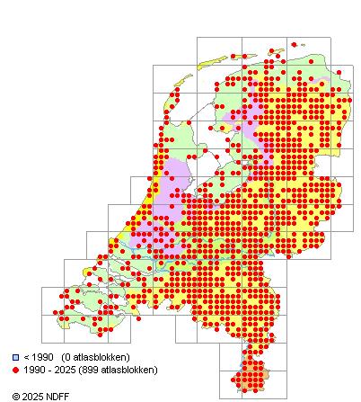 Het aantal atlasblokken (5x5 km) waarin de soort is gemeld binnen een periode van vijf jaar (vanaf 1980) of twintig jaar. Niet gecorrigeerd voor waarnemersinspanning en het aantal doorgegeven waarnemingen kan sterk variëren per periode, dus een trend in verspreiding kan hier niet direct uit worden afgelezen. Het opgegeven jaartal is het eerste jaar van de periode. Bron: gevalideerde waarnemingen uit de NDFF.
