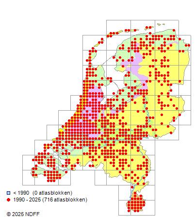 Het aantal atlasblokken (5x5 km) waarin de soort is gemeld binnen een periode van vijf jaar (vanaf 1980) of twintig jaar. Niet gecorrigeerd voor waarnemersinspanning en het aantal doorgegeven waarnemingen kan sterk variëren per periode, dus een trend in verspreiding kan hier niet direct uit worden afgelezen. Het opgegeven jaartal is het eerste jaar van de periode. Bron: gevalideerde waarnemingen uit de NDFF.