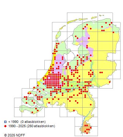 Het aantal atlasblokken (5x5 km) waarin de soort is gemeld binnen een periode van vijf jaar (vanaf 1980) of twintig jaar. Niet gecorrigeerd voor waarnemersinspanning en het aantal doorgegeven waarnemingen kan sterk variëren per periode, dus een trend in verspreiding kan hier niet direct uit worden afgelezen. Het opgegeven jaartal is het eerste jaar van de periode. Bron: gevalideerde waarnemingen uit de NDFF.