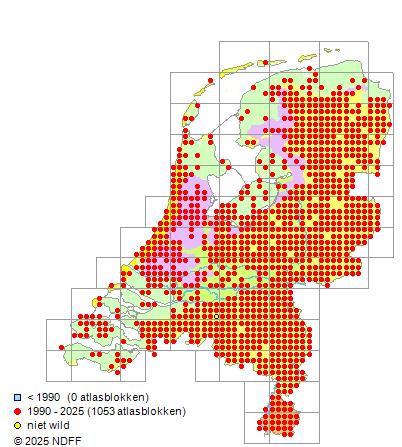 Het aantal atlasblokken (5x5 km) waarin de soort is gemeld binnen een periode van vijf jaar (vanaf 1980) of twintig jaar. Niet gecorrigeerd voor waarnemersinspanning en het aantal doorgegeven waarnemingen kan sterk variëren per periode, dus een trend in verspreiding kan hier niet direct uit worden afgelezen. Het opgegeven jaartal is het eerste jaar van de periode. Bron: gevalideerde waarnemingen uit de NDFF.
