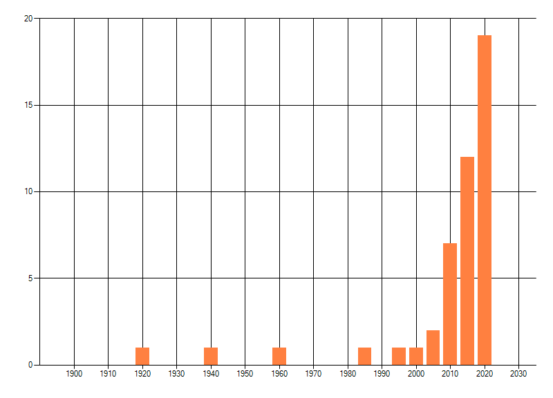 Het aantal atlasblokken (5x5 km) waarin de soort is gemeld binnen een periode van vijf jaar (vanaf 1980) of twintig jaar. Niet gecorrigeerd voor waarnemersinspanning en het aantal doorgegeven waarnemingen kan sterk variëren per periode, dus een trend in verspreiding kan hier niet direct uit worden afgelezen. Het opgegeven jaartal is het eerste jaar van de periode. Bron: gevalideerde waarnemingen uit de NDFF.