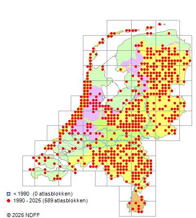 Het aantal atlasblokken (5x5 km) waarin de soort is gemeld binnen een periode van vijf jaar (vanaf 1980) of twintig jaar. Niet gecorrigeerd voor waarnemersinspanning en het aantal doorgegeven waarnemingen kan sterk variëren per periode, dus een trend in verspreiding kan hier niet direct uit worden afgelezen. Het opgegeven jaartal is het eerste jaar van de periode. Bron: gevalideerde waarnemingen uit de NDFF.