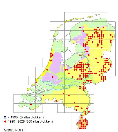 Het aantal atlasblokken (5x5 km) waarin de soort is gemeld binnen een periode van vijf jaar (vanaf 1980) of twintig jaar. Niet gecorrigeerd voor waarnemersinspanning en het aantal doorgegeven waarnemingen kan sterk variëren per periode, dus een trend in verspreiding kan hier niet direct uit worden afgelezen. Het opgegeven jaartal is het eerste jaar van de periode. Bron: gevalideerde waarnemingen uit de NDFF.