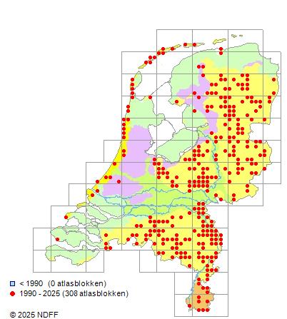 Het aantal atlasblokken (5x5 km) waarin de soort is gemeld binnen een periode van vijf jaar (vanaf 1980) of twintig jaar. Niet gecorrigeerd voor waarnemersinspanning en het aantal doorgegeven waarnemingen kan sterk variëren per periode, dus een trend in verspreiding kan hier niet direct uit worden afgelezen. Het opgegeven jaartal is het eerste jaar van de periode. Bron: gevalideerde waarnemingen uit de NDFF.