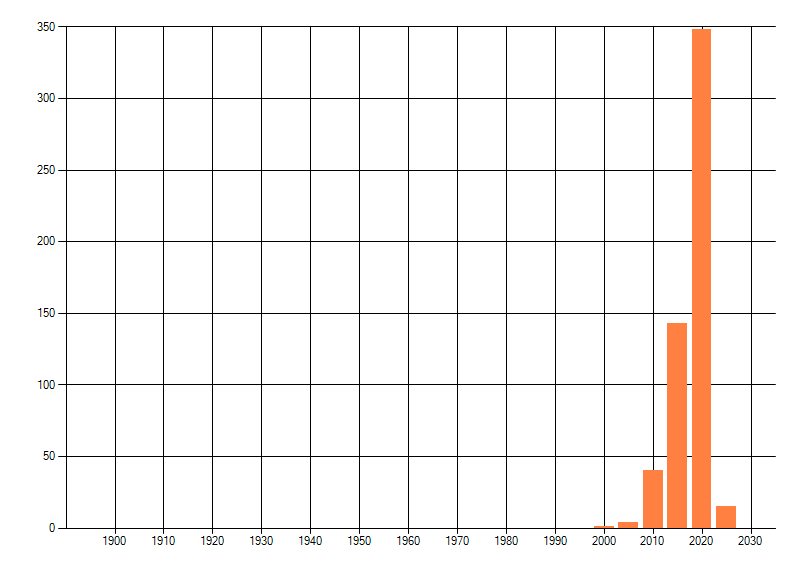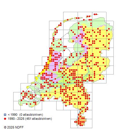Het aantal atlasblokken (5x5 km) waarin de soort is gemeld binnen een periode van vijf jaar (vanaf 1980) of twintig jaar. Niet gecorrigeerd voor waarnemersinspanning en het aantal doorgegeven waarnemingen kan sterk variëren per periode, dus een trend in verspreiding kan hier niet direct uit worden afgelezen. Het opgegeven jaartal is het eerste jaar van de periode. Bron: gevalideerde waarnemingen uit de NDFF.