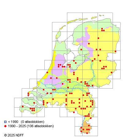 Het aantal atlasblokken (5x5 km) waarin de soort is gemeld binnen een periode van vijf jaar (vanaf 1980) of twintig jaar. Niet gecorrigeerd voor waarnemersinspanning en het aantal doorgegeven waarnemingen kan sterk variëren per periode, dus een trend in verspreiding kan hier niet direct uit worden afgelezen. Het opgegeven jaartal is het eerste jaar van de periode. Bron: gevalideerde waarnemingen uit de NDFF.