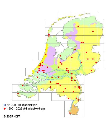 Het aantal atlasblokken (5x5 km) waarin de soort is gemeld binnen een periode van vijf jaar (vanaf 1980) of twintig jaar. Niet gecorrigeerd voor waarnemersinspanning en het aantal doorgegeven waarnemingen kan sterk variëren per periode, dus een trend in verspreiding kan hier niet direct uit worden afgelezen. Het opgegeven jaartal is het eerste jaar van de periode. Bron: gevalideerde waarnemingen uit de NDFF.