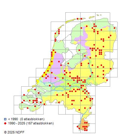 Het aantal atlasblokken (5x5 km) waarin de soort is gemeld binnen een periode van vijf jaar (vanaf 1980) of twintig jaar. Niet gecorrigeerd voor waarnemersinspanning en het aantal doorgegeven waarnemingen kan sterk variëren per periode, dus een trend in verspreiding kan hier niet direct uit worden afgelezen. Het opgegeven jaartal is het eerste jaar van de periode. Bron: gevalideerde waarnemingen uit de NDFF.