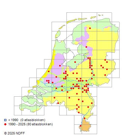 Het aantal atlasblokken (5x5 km) waarin de soort is gemeld binnen een periode van vijf jaar (vanaf 1980) of twintig jaar. Niet gecorrigeerd voor waarnemersinspanning en het aantal doorgegeven waarnemingen kan sterk variëren per periode, dus een trend in verspreiding kan hier niet direct uit worden afgelezen. Het opgegeven jaartal is het eerste jaar van de periode. Bron: gevalideerde waarnemingen uit de NDFF.