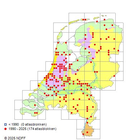 Het aantal atlasblokken (5x5 km) waarin de soort is gemeld binnen een periode van vijf jaar (vanaf 1980) of twintig jaar. Niet gecorrigeerd voor waarnemersinspanning en het aantal doorgegeven waarnemingen kan sterk variëren per periode, dus een trend in verspreiding kan hier niet direct uit worden afgelezen. Het opgegeven jaartal is het eerste jaar van de periode. Bron: gevalideerde waarnemingen uit de NDFF.