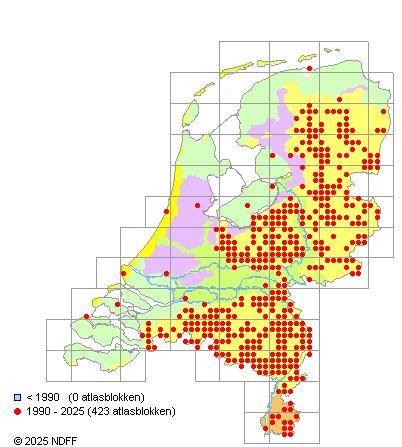 Het aantal atlasblokken (5x5 km) waarin de soort is gemeld binnen een periode van vijf jaar (vanaf 1980) of twintig jaar. Niet gecorrigeerd voor waarnemersinspanning en het aantal doorgegeven waarnemingen kan sterk variëren per periode, dus een trend in verspreiding kan hier niet direct uit worden afgelezen. Het opgegeven jaartal is het eerste jaar van de periode. Bron: gevalideerde waarnemingen uit de NDFF.