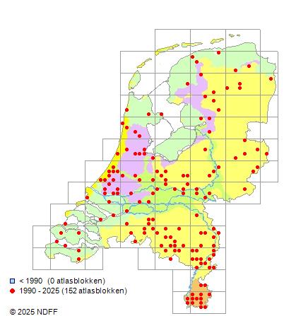 Het aantal atlasblokken (5x5 km) waarin de soort is gemeld binnen een periode van vijf jaar (vanaf 1980) of twintig jaar. Niet gecorrigeerd voor waarnemersinspanning en het aantal doorgegeven waarnemingen kan sterk variëren per periode, dus een trend in verspreiding kan hier niet direct uit worden afgelezen. Het opgegeven jaartal is het eerste jaar van de periode. Bron: gevalideerde waarnemingen uit de NDFF.