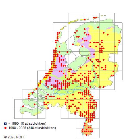 Het aantal atlasblokken (5x5 km) waarin de soort is gemeld binnen een periode van vijf jaar (vanaf 1980) of twintig jaar. Niet gecorrigeerd voor waarnemersinspanning en het aantal doorgegeven waarnemingen kan sterk variëren per periode, dus een trend in verspreiding kan hier niet direct uit worden afgelezen. Het opgegeven jaartal is het eerste jaar van de periode. Bron: gevalideerde waarnemingen uit de NDFF.