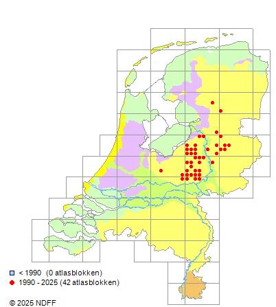 Het aantal atlasblokken (5x5 km) waarin de soort is gemeld binnen een periode van vijf jaar (vanaf 1980) of twintig jaar. Niet gecorrigeerd voor waarnemersinspanning en het aantal doorgegeven waarnemingen kan sterk variëren per periode, dus een trend in verspreiding kan hier niet direct uit worden afgelezen. Het opgegeven jaartal is het eerste jaar van de periode. Bron: gevalideerde waarnemingen uit de NDFF.