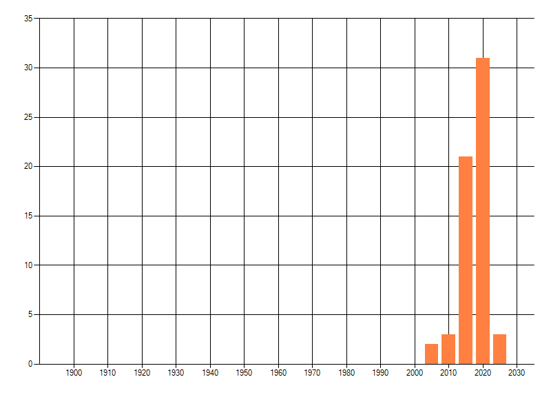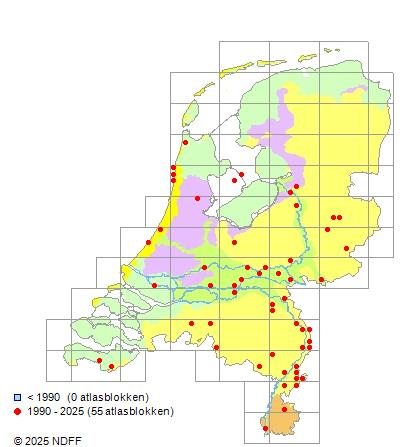 Het aantal atlasblokken (5x5 km) waarin de soort is gemeld binnen een periode van vijf jaar (vanaf 1980) of twintig jaar. Niet gecorrigeerd voor waarnemersinspanning en het aantal doorgegeven waarnemingen kan sterk variëren per periode, dus een trend in verspreiding kan hier niet direct uit worden afgelezen. Het opgegeven jaartal is het eerste jaar van de periode. Bron: gevalideerde waarnemingen uit de NDFF.