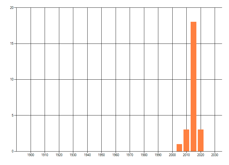 Het aantal atlasblokken (5x5 km) waarin de soort is gemeld binnen een periode van vijf jaar (vanaf 1980) of twintig jaar. Niet gecorrigeerd voor waarnemersinspanning en het aantal doorgegeven waarnemingen kan sterk variëren per periode, dus een trend in verspreiding kan hier niet direct uit worden afgelezen. Het opgegeven jaartal is het eerste jaar van de periode. Bron: gevalideerde waarnemingen uit de NDFF.