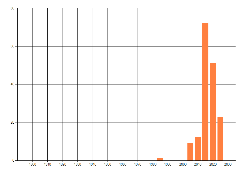 Het aantal atlasblokken (5x5 km) waarin de soort is gemeld binnen een periode van vijf jaar (vanaf 1980) of twintig jaar. Niet gecorrigeerd voor waarnemersinspanning en het aantal doorgegeven waarnemingen kan sterk variëren per periode, dus een trend in verspreiding kan hier niet direct uit worden afgelezen. Het opgegeven jaartal is het eerste jaar van de periode. Bron: gevalideerde waarnemingen uit de NDFF.